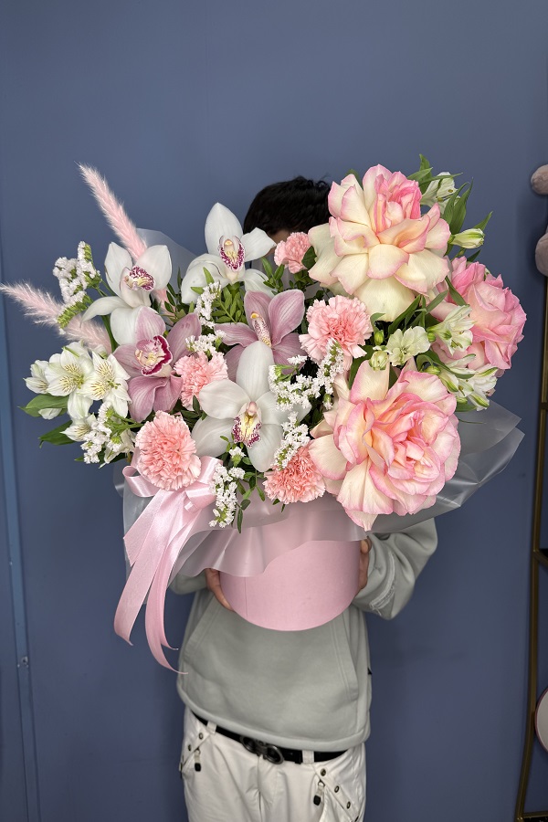 Композиция в шляпной коробке Весенняя нежность состоит из: