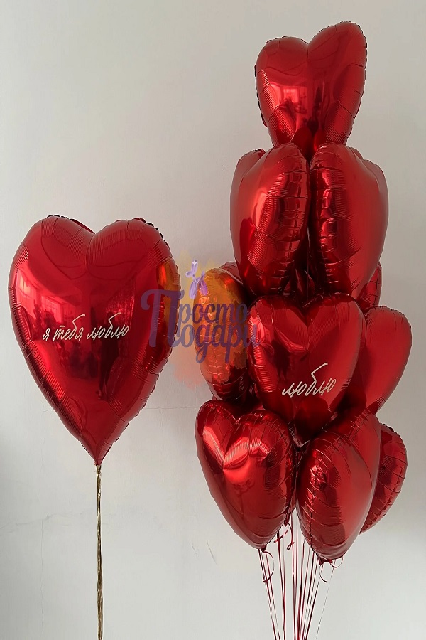 Набор №932 воздушных шаров красное сердце с надписью и фонтан из 15 красных сердец