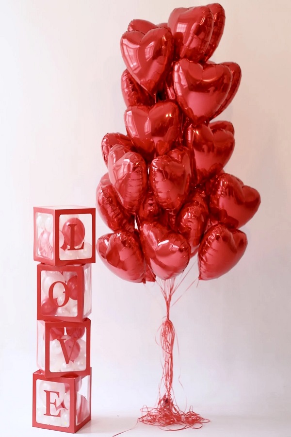 Набор из воздушных шаров Кубики с надписью LOVE наполнены шариками с фонтаном из фольгированных шаров